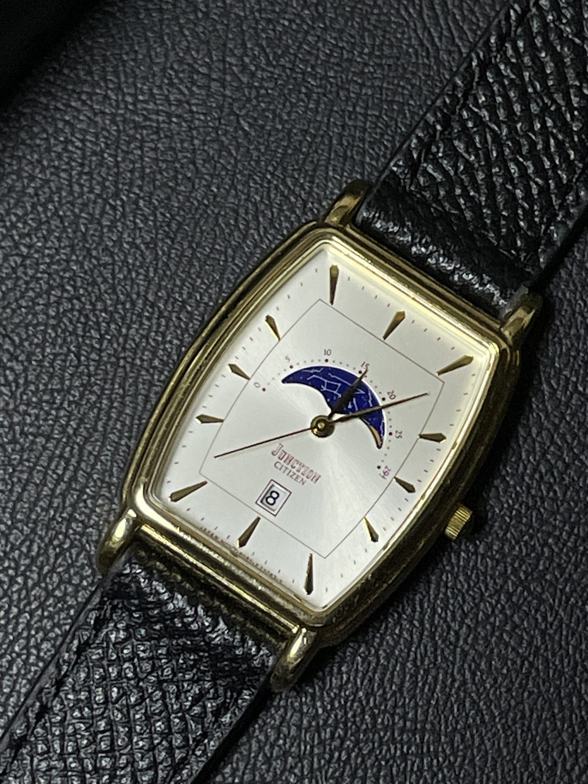 Một chiếc Citizen cổ điển hiếm gặp với mặt số hiển thị lịch trăng Moonphase rất thơ mộng – một lựa chọn đáng giá cho những ai yêu đồng hồ vintage độc lạ.