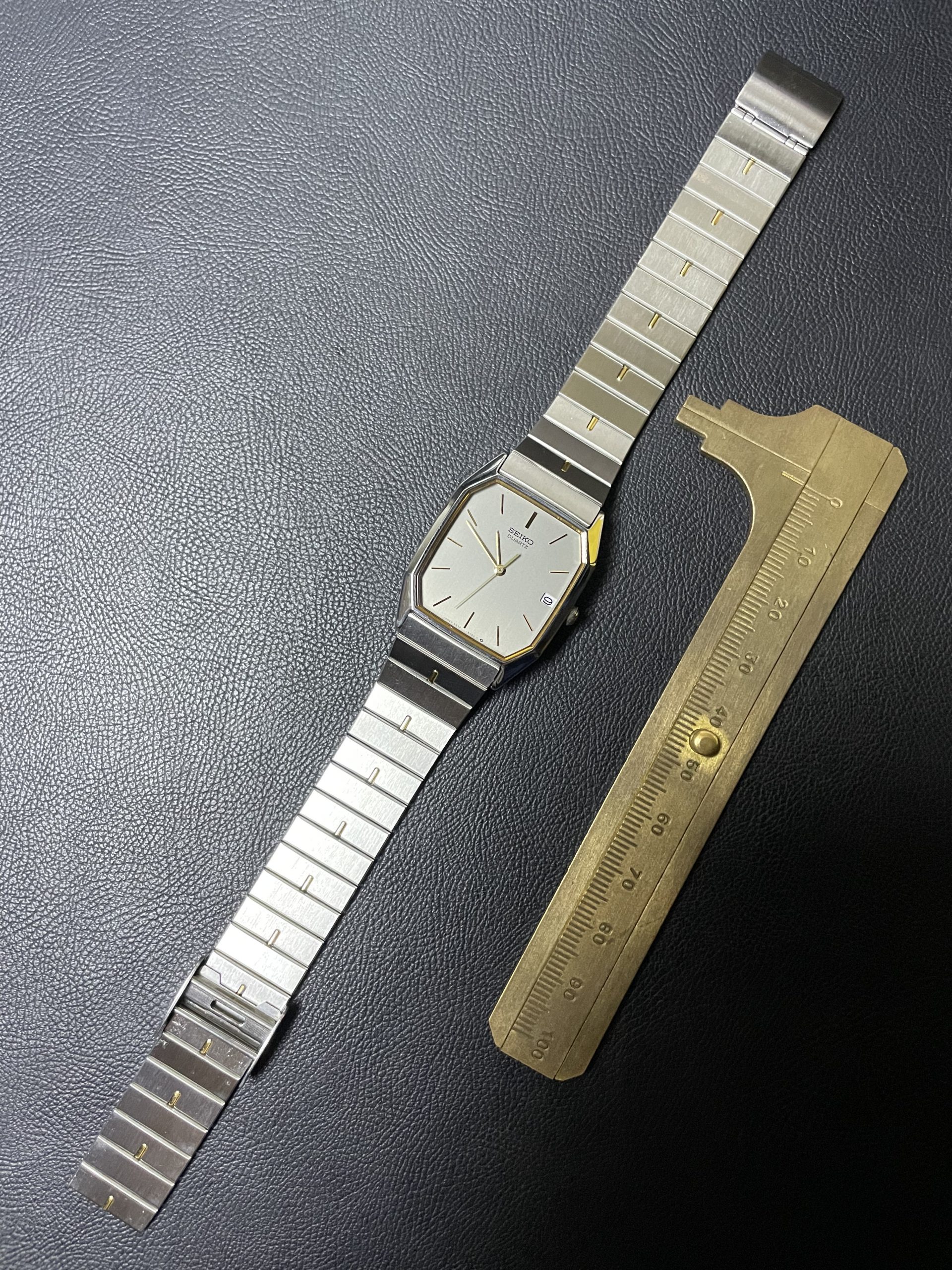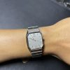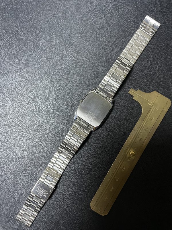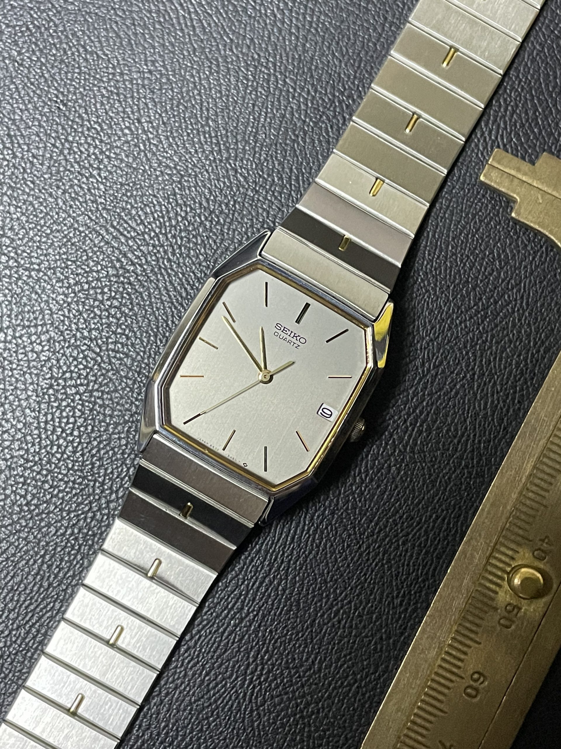 Chiếc tank Seiko cắt góc độc đáo, hiếm gặp với phối màu cổ điển: mặt xám thép ánh mờ, nổi bật với cọc số & kim vàng ánh kim – phối kim loại demi sang trọng, dáng chuẩn nam cổ tay nhỏ – trung, hoặc unisex.
